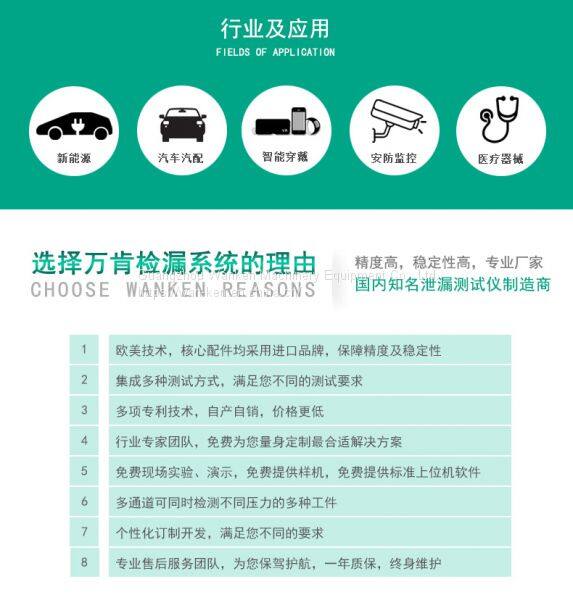 Positive and negative pressure leak detectors, double pressure leak detectors and 12-channel leak detectors improve the production efficiency of enterprises, and reduce the number of instruments required by enterprises. They also reduce the labor intensity of workers. The company's air-tight leak detectors are widely used in automotive parts, gas tools, medical and health, mechanical valves and other industries.