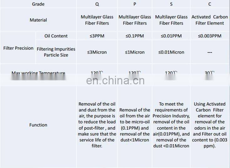 Filter series of introduction: the company adopted the German design of high quality filter material and technology, with super hydrophobic breathable performance,it can completely clean up oil in compressed air, liquid water, impurities, the equivalent replacement of various importedbrands of filter element, Hankison, Domnick-Hunter,America British Italy Hiross, Germany Ultrafilter, Germany Zander, Allas CopcoAtlas original brand filter element, in order to meet the needs of different users.
