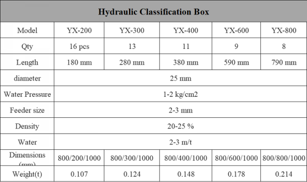 Hydraulic classification boxis a cone angle iron box, there is an upper sand wedge blocking Article, the following classification Xiangdi valve fitted. Usually from 200 mm to 800 mm width of the graded series of boxes connected with ordinary sink is made from coarse-to-fine Grit Chamber discharged.