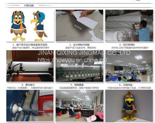 1.Jinan Defang is a professional plush toy and plush items manufacture with about 200 workers. Our business scope include plush stuffed toys, cloth plush sound toys, plush backpack, plush slippers, plush backpack, plush keychain, plush hand puppets, simulation plush toys, marine toys, infant toys and baby toys. OEM and ODM service is available.