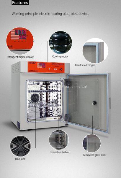 Adopt carbon fiber heating film to heating, cavity preheating; Inside and outside the double door structure, the door in side full tempered glass door; shell is made of cold-rolled material, static plastic spray surface, attractive appearance; mirror stainless steel, corners semicircular is easy to clean up and down pitch adjustable shelf; a small breeze circulation does not affect culture small or powder materials; microcomputer intelligent PID control, touch-button set with timing and over temperature alarm function.