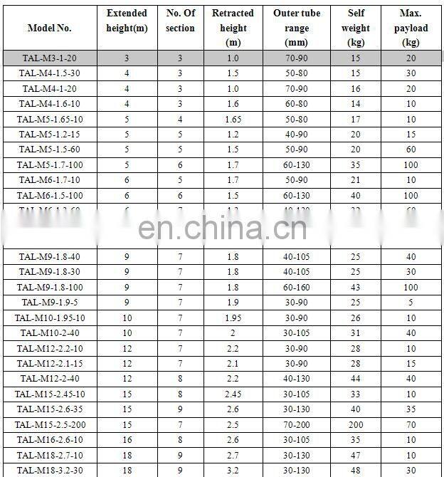 It has manual, motorized and pneumatic lifting method, the extended length up to 35m and closed length to 1.3m.
