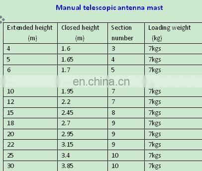 1)The telescopic pole auto 8 m can be installed on the ground, or on the vehicle. No matter where to install, its installation shall keep vertical with the ground.Tilted telescopic antenna mast will affect the rise and fall of itself, and if the telescopic antenna mast tilts seriously or maintain a long time, damage and danger could not be avoided.