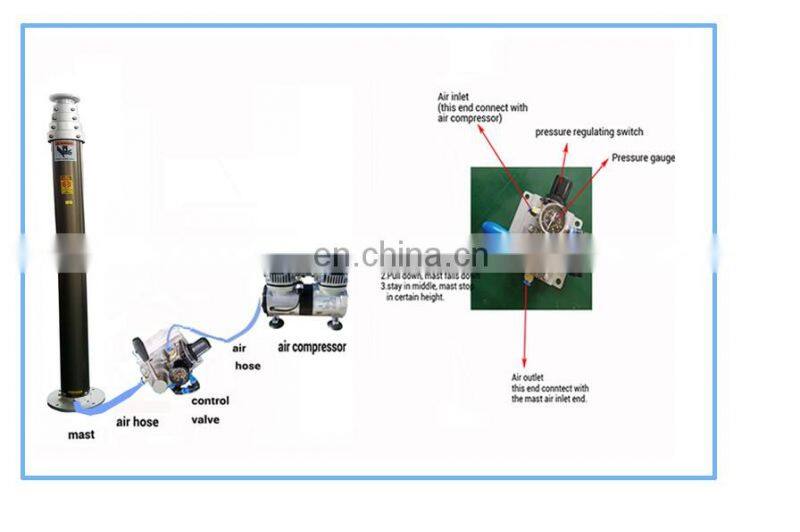 1)The pneumatic telescopic mast can be installed on the ground, or on the vehicle. No matter where to install, its installation shall keep vertical with the ground.Tilted telescopic antenna mast will affect the rise and fall of itself, and if the lifting rod tilts seriously or maintain a long time, damage and danger could not be avoided.
