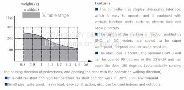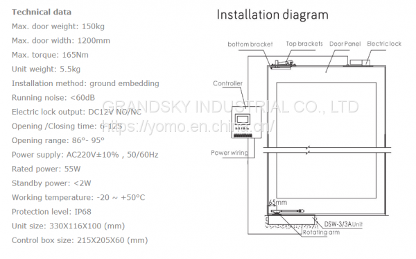 Fit door weight:60-85kg/door Suitable for door :weight≤70kg wide≤900mm Supply power:220V±10% , 50/60Hz Opening time:1-30s Max.Opening angle: ≤105° Protection grade:IP12D Product material:304 Stainless steel , Kirsite Product weight:8.5kg Product volume:470X135X90mm ambient temperature :-20℃~+50℃ |