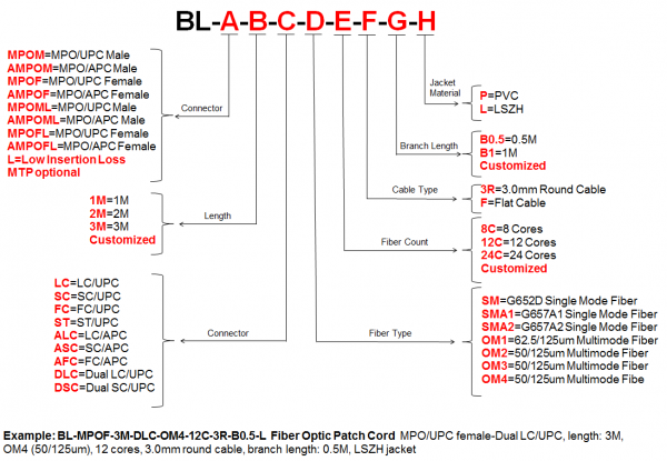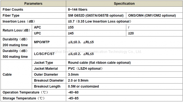 Brellet Telecom's MPO/MTP Breakout Optical Patch Cord consists of multi-fiber cable and MPO Connectors and LC/SC/FC/ST connectors terminated at both ends. with low insertion loss, high return Loss, and good durability, it is widely used in data centers and other high-density integrated fiber optic line Environments which need to save space and reduce cable management troubles.