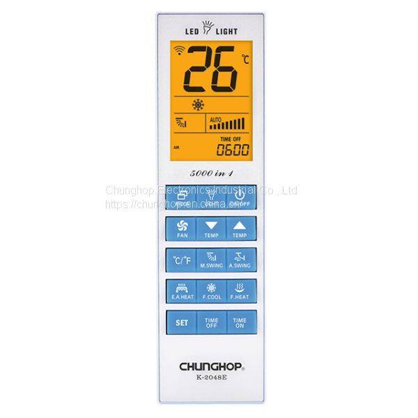 K-2048E is a universal air conditioner remote control with big button and large display , it has 5000 codes in 1 .The remote control is compatible with most or all models of air conditioners of all brands manufactured by the countries around the world (such as: Daikin, Fujitsu, Panansonic, Sharp, Hitachi, Toshiba, Samsung, LG, Carrier, York,etc.) With the LCD display, the simple operation and the power off memory function , the remote control is the best choice of the damage , loss and replacement of the remote control .