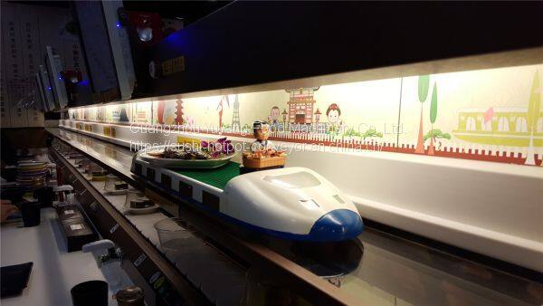 The device can be designed in any shape according to the layout of the storefront and the requirements of the customer. The dining table is the same as the rotary sushi conveyor. It can also be designed according to the layout of the store or the requirements of the customer. There are many choices for the decorative materials of the dining table, such as stainless steel, marble, LED lights...etc., customers can choose to decorate in the local area, we provide raw materials to send out.