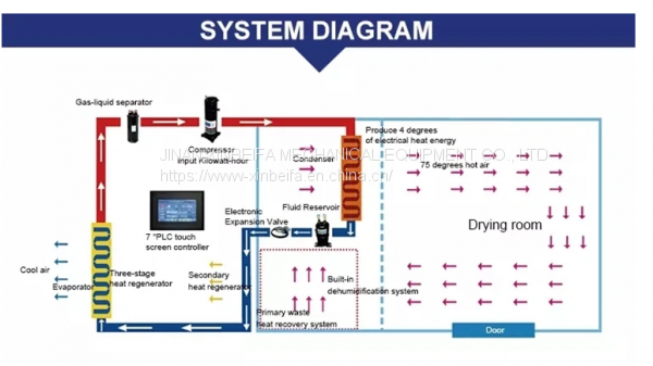 2. Energy saving and high efficiency: using clean electric energy to work, the drying operation cost is only 40% of oil drying equipment, 60% of coal drying machine and 30% of electric heating drying machine, saving more than 60% of energy compared with ordinary drying equipment.A closed dehumidification mode is adopted, without discharging waste heat to the outside world.Patented level 3 waste heat recovery technology, rapid discharge of water while your heat loss.