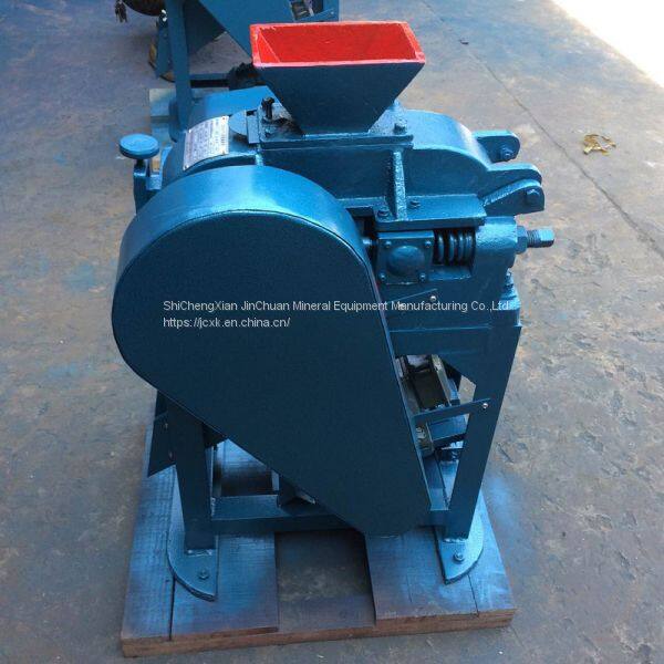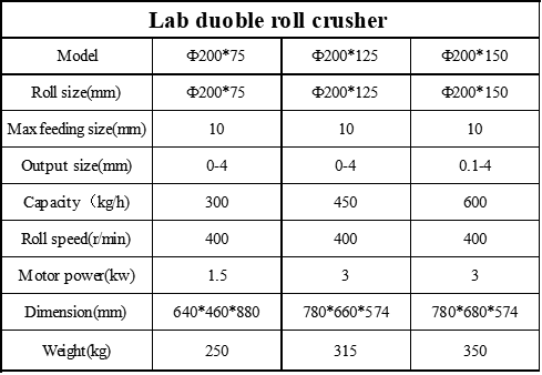 Laboratory Double Roll Crusher consists of roll wheel, roll bearing, pressing device, adjusting device and driving device etc. Discharging size adjustment: between two roller equipped with cuneate or gasket adjusting device, top of the wedge device capped with adjustment bolts. When the adjustment bolts pull upward wedge which will bear against the fixed wheel to make it deviate from the movable roller wheel, then the gap between wheels become large, discharging size become bigger, otherwise the opposite, gasket device is through the quantity or thickness to adjust the materials size.