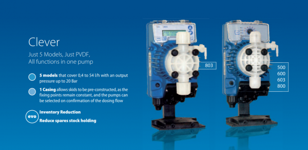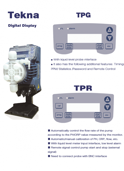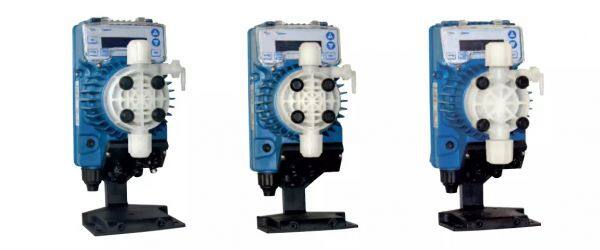 Tekna consists of five diaphragm pumps that typically deliver precise chlorine levels in swimming pool stoichiometry while delivering antibiotics to livestock drinking water.
