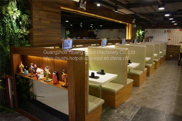 Rotary hot pot conveying equipment, self-propelled rotary hot pot is upgraded from Taiwan's Shabu-Shabu. The introduction of Taiwan's advanced technology, innovative design and best quality of the country in the Japanese food machinery industry have made Taiwan Sushi Express, China Yuanlv Sushi designate us as a long-term partner. In addition, it adopts high-strength 304 stainless steel components, which are designed and manufactured by excellent engineers and assemblers. It has the characteristics of safety, stable transmission, no noise, wear-resistance, hygiene and easy cleaning. The appearance is both fashionable and human. This feature is unique.