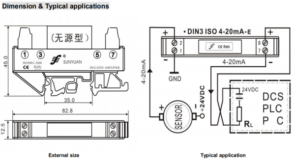 SUNYUAN Extra-small low cost standard DIN rail35 Package Two-wire 4-20mA Signal Isolated controller can convert active 4-20mA current signal into isolated passive controlling signal to control the two-wire powered (explosion-prevention method) 4-20mA current loop. The module achieves the matching between sensor signals acquisition and active load from analog input end, which effectively solves problems on the conflict between the active 4-20mA current signal and power supply of two-wire current loop input end.
