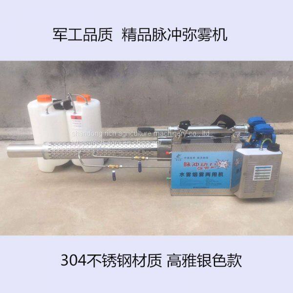 2.Smoke: need to add smoke agent(smoke agent or diesel fuel), if diesel fuel as smoke agent, it is best to use a double-tube mist machine, smoke suitable for large-scale spraying operations, smoke injection distance up to 20-30 meters, a box of agents can operate about 30 acres of land, Suitable for non-suitable for sex crop spraying operations, such as poplar, camphor and landscaping; It can also be used for killing operations. Smoke also has anti-freeze insulation and other effects.
