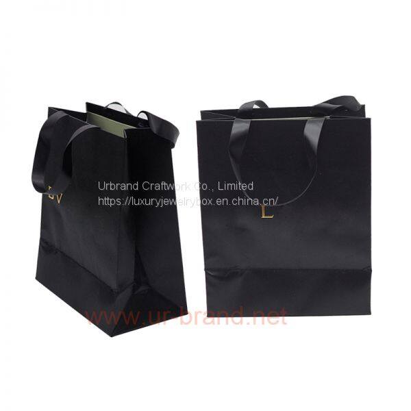 Custom Made High Quality Logo Gold Foil Stamping Matt Black Paper Bag With Ribbon Handle Urbrand
