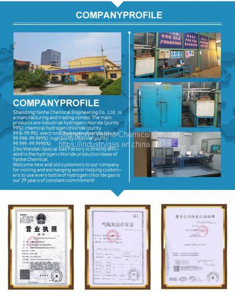Shandong Yanhe Chemical Co., Ltd., is a manufacturing and trading combo. The main products are industrial hydrogen chloride (purity: 99%), chemical hydrogen chloride (purity: 99.8-99.9%), electronic hydrogen chloride (purity: 99.998-99.999%), high purity chlorine (purity: 99.999-99.9995%).