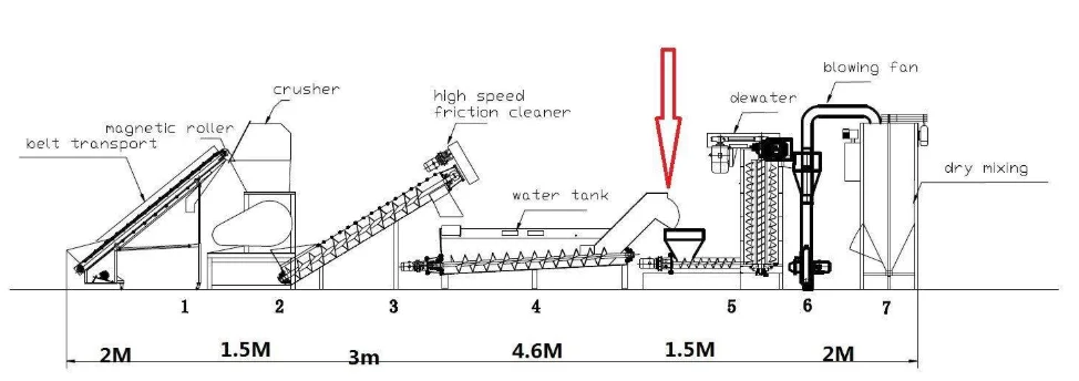 This PP.PE film washing and recycling line is mainly consist 01 the following machines: Belt: conveyor .metal detector ,crusher,screw feeder,high speed friction washer,floating washer,dewatering machine and drier.