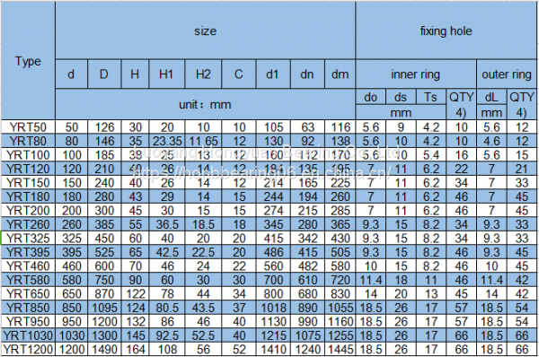 YRT basic rotary table bearings are designed with a radial full roller, two groups of axial needle roller, cage assembly, an out ring, an L-section inner and the second ring. The out ring and inner ring have fixing holes, so the bolt can fix the bearings directly. YRT rotary table bearing structure can bear double-direction axial load, radial load and tilting moment. This series bearing have preload before leaving factory, no need to adjust clearance when installed. This series bearing is particularly suitable for the situation of high precision, high stiffness, low speed, and short rotate period such as rotary table, index heads and revolving milling heads.(HONBbearing06)