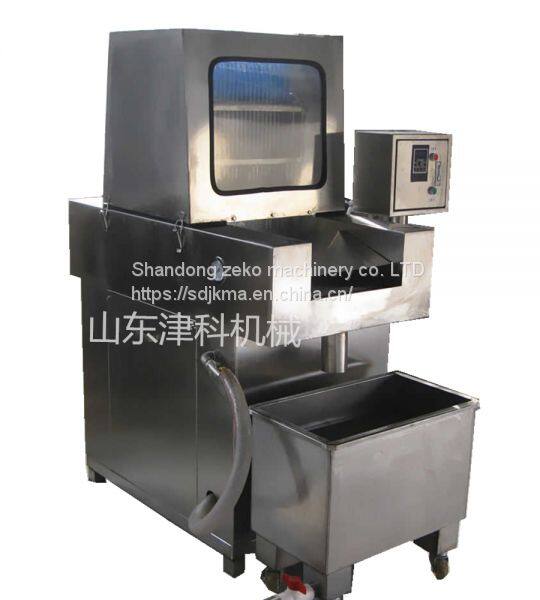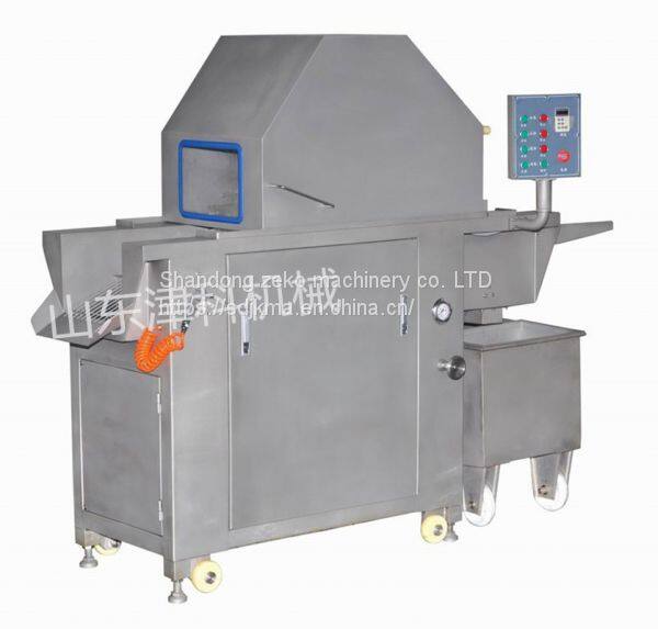 The chicken leg saline injection machine supplied by the manufacturer moves the material forward through the transmission belt. When the injection needle moves down to the midpoint, the conveyor stops moving, the meat plate presses the meat block, and the injection needle is continuously injected into the meat block until it reaches Set time. When the injection needle returns to the midpoint of the stroke, the conveyor belt drives the meat mass to start moving forward. Manufacturers supply chicken leg saline injection machine with frequency conversion function, which can adjust the injection pressure, step distance, step speed and other parameters according to the requirements of the production product to ensure the processing requirements of different products. The injection pressure of the chicken leg saline injection machine supplied by the manufacturer can be adjusted between 0.1-0.8MPa according to different products. The pressure gauge shows that the injection pressure is intuitive and convenient. Each injection needle is independent. When the injection needle is blocked, it is only necessary to remove the blocked injection needle for cleaning. In addition to meat processing, this equipment is also successfully applied to the injection processing of fish, sea cucumber, poultry and other products by changing needles. Shandong Zeko Machinery Co., Ltd. provides you with meat processing equipment such as saline injection machine, meat bowl cutting machine, enema machine, etc. The product has a variety of specifications to meet the needs of different customers. All employees of the company warmly welcome your visit and visit.