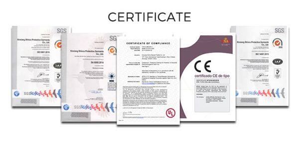 FR Workwear protects your workers against flash fire and required by law in wide industries and is regulated by numerous safety standards boards. Xinke Protective has acquired the certificates, such as ISO 9001, ISO 14000, SA 8000, CE, UL.
