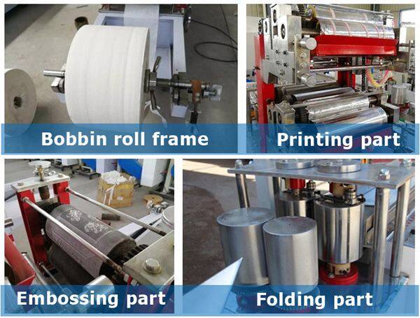 The automatic paper napkin embossing folding machine is used for embossing, folding, electronic counting, cutting and processing the bobbin paper into a rectangular or square napkin product with clear pattern, neat and beautiful appearance. Because of the high degree of automation, good processing quality and high production efficiency, it is an ideal equipment for paper making factory to get rich with small investment and quick effect. In addition, embossing can produce various clear and beautiful patterns according to the needs of users.