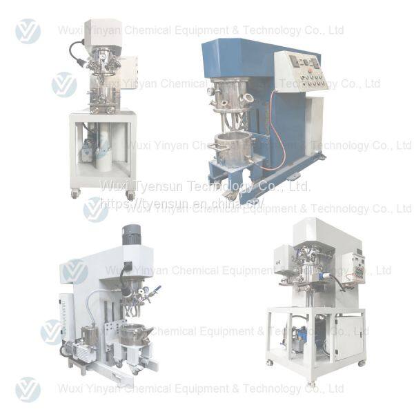 YINAYN small lab scale double planetary vacuum mixer, which is new and high efficient mixing equipment designed for universities, research institute and factory lab. It is quite suitable for the high viscous materials such as adhesive, silicone, lithium battery slurry etc. It has scraper to ensure no residue on the wall and bottom of container. It also can be equipped with extruder and slide rail to realize the integration of mixing and discharging. consists of reducer, planetary rack, mixing agitator, scrapers, mixing tank, hydraulic system and machine rack. When the planetary structure is running, the low-speed mixing shaft and high-speed dispersing shaft are working rotation and revolution together, it makes the materials under the strong shearing and kneading, to reach a complete uniform result. The planetary structure has scraper design, when it is working, it scrapes on the inner wall of the mixing tank, the mixing tank which is precision processed by large vertical lath machine and polished, then can make sure there is no residual on the inner wall. In additional, options of the scrapers which is equipped on the mixing structure, it can scrape the bottom of the mixing tank. To be ensure the mixing completely and keep the quality of the mixture product.