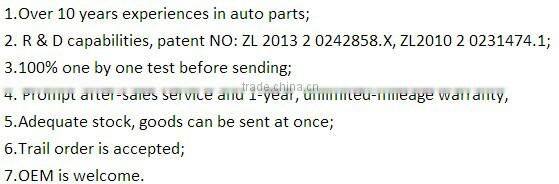 About us: tWe are a professional supplier dealing with integrated auto parts. Our main products are Steering Wheel Switch,Window Lifter Master Switch,Window Lifter Switch Button,Ignition Coil, Oxygen Sensor, Vacuum Sensor,Knock Sensor,Parking Sensor,Crankshaft Position Sensor,Water Temperature Sensor,Sprial Cable Sub-assy,Window Lifter Motor,Fuel Pump,Fuel Injector,Idle Motor etc,.We possess widely channels for the products and grasp all the technics of auto parts process. We have excellent work teams on operations and professional management information system on auto parts.