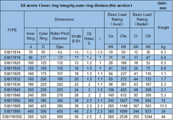 SX series(outer ring division type with inner rotating, thin section),this type has smaller section than HYHYRB series. Due to the extremely thin structure, there is no mounting holes on the outer ring and the inner ring, so the model requires a presser flange or housing.(HONBbearing06)