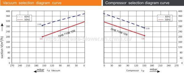 The following Pressure-flow performance curve is measured under the condition of suction of 15 °C air and exhaust pressure 1013mbar.