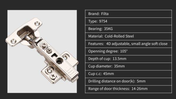 Filta Furniture Hardware NEW 35mm 4D Adjustable Soft Closing Clip On Cabinet Cupboard Frameless Door Hinge