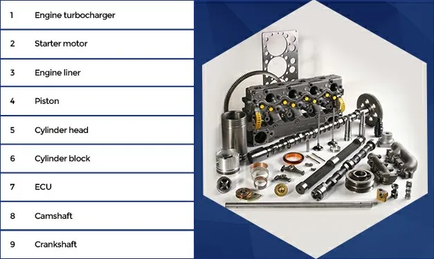 Piston,liner, gasket set, bearing, valve, crankshaft,connect rod, camshaft,cyl block,cyl head, turbo,starter, water pump, alternator, feed pump, injector, fuel pump.......