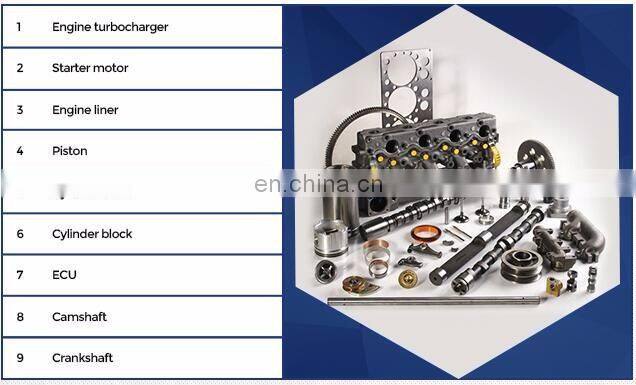 Cylinder block, Cylinder head, Crankshaft, Camshaft, Connecting rod, Engine assy, Injector, Fuel injection pump, Oil pump, Feed pump, Oil cooler, Filter, Turbo charger, Starter, Alternator, Water pump, Fan blade, Liner kits, Bearings, Valves, Gasket kit, etc.