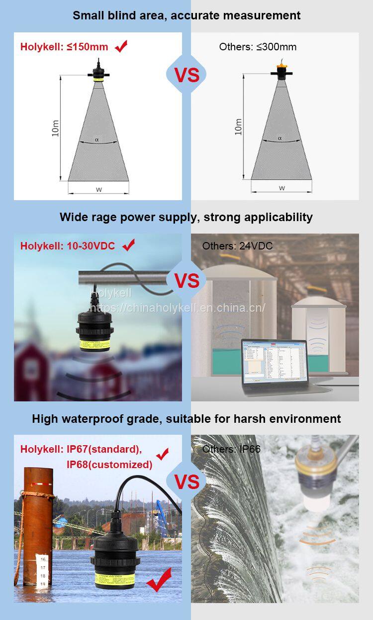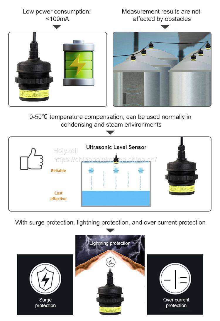 Advantages: The Holykell Ultrasonic Level Sensor UE3003 offers several advantages that set it apart from traditional level measurement methods. Firstly, its non-contact measurement principle eliminates the need for physical contact with the measured media, ensuring compatibility with a wide range of liquids and solids. This feature minimizes maintenance requirements and reduces the risk of contamination or damage to the sensor.