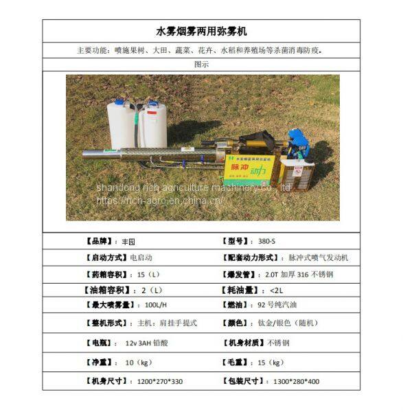 2.Smoke: need to add smoke agent(smoke agent or diesel fuel), if diesel fuel as smoke agent, it is best to use a double-tube mist machine, smoke suitable for large-scale spraying operations, smoke injection distance up to 20-30 meters, a box of agents can operate about 30 acres of land, Suitable for non-suitable for sex crop spraying operations, such as poplar, camphor and landscaping; It can also be used for killing operations. Smoke also has anti-freeze insulation and other effects.