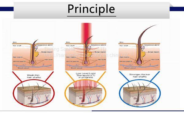 The 808nm and 650nm diode laser penetrate into the scalp softly by low level lights, then the laser energy can stimulate the the hair follicle, let the not active hair follicle awake. Also let the scalp be healthy, promotion for improved hair quality. So there is going to be a good result for hair growth treatment.