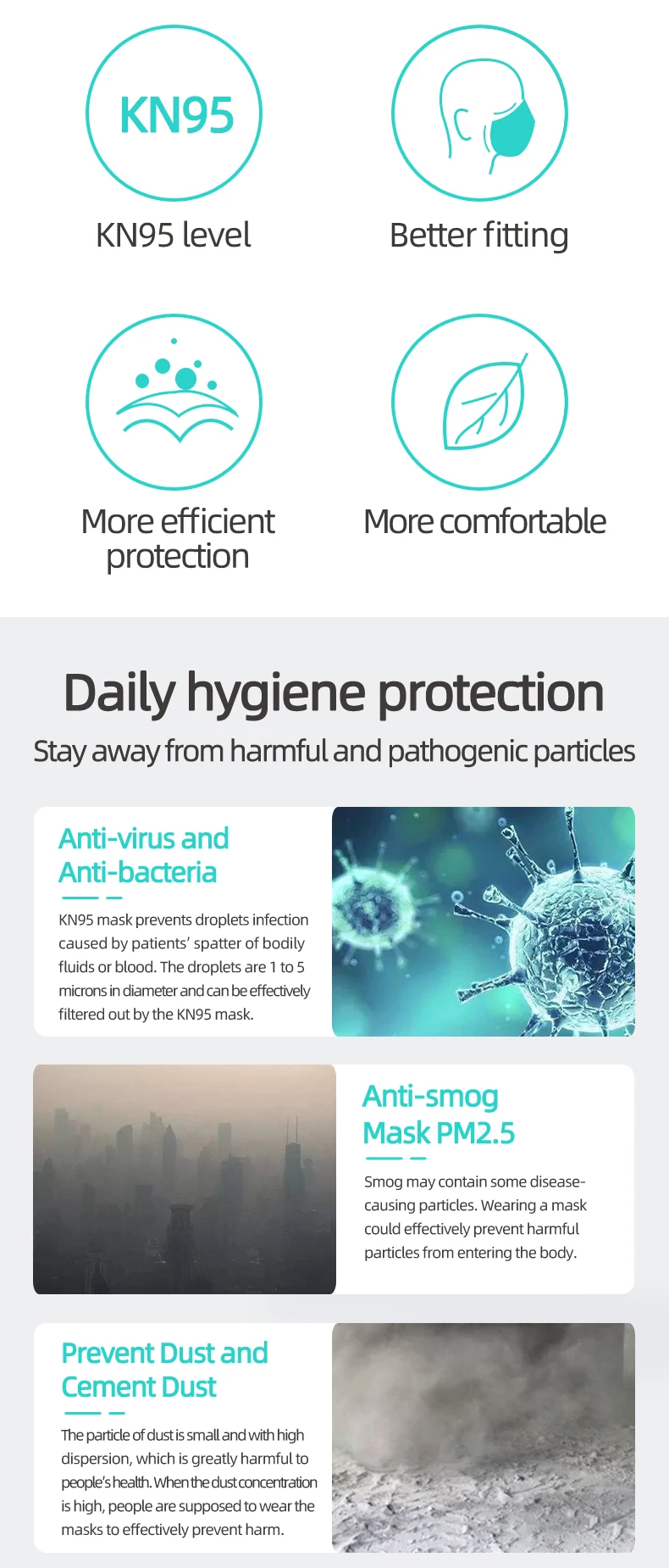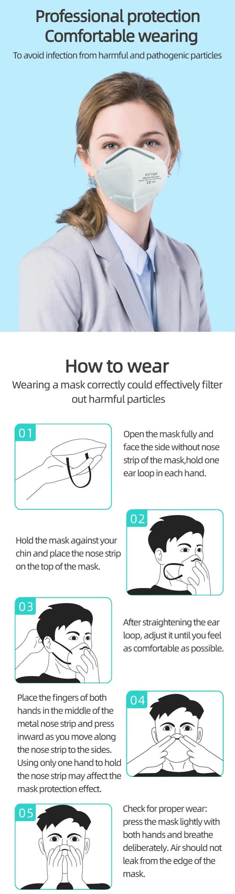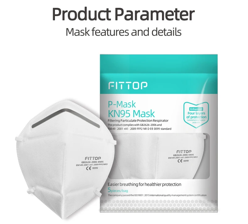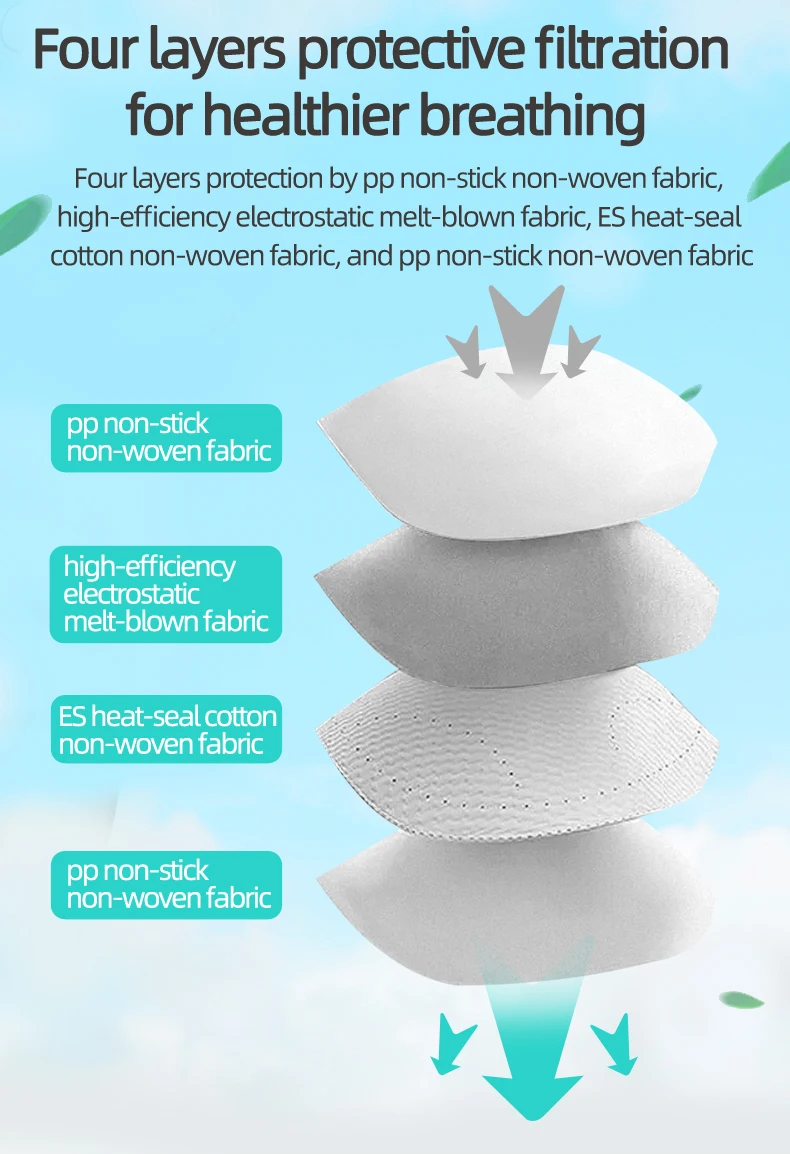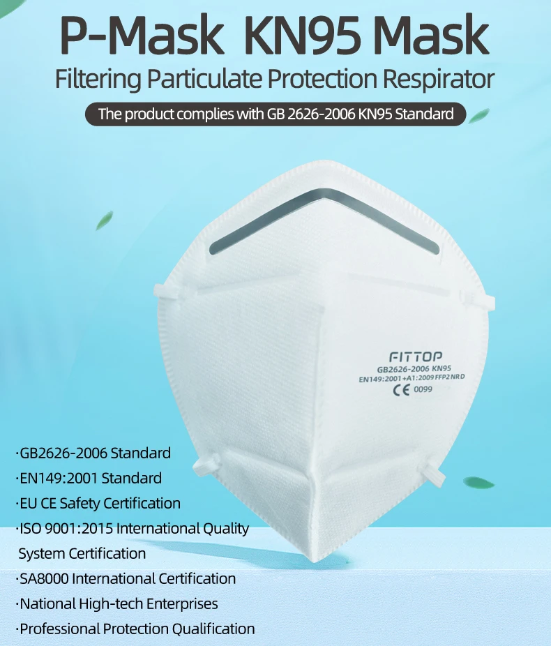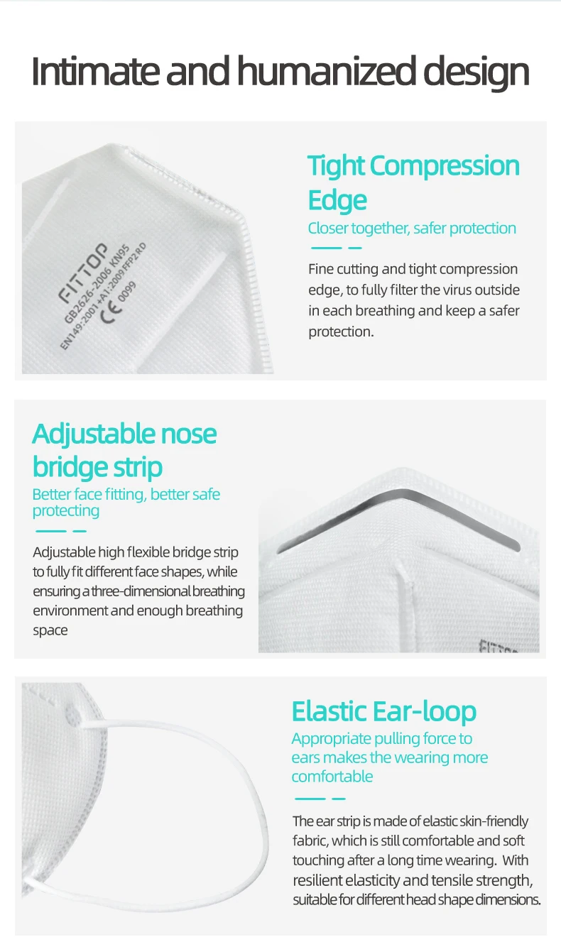 Product Performance: pp non-stick non-woven fabric, high-efficiency electrostatic melt-blown, ES heat-seal cotton non-woven fabric, pp non-stick non-woven fabric are adopted. Comfortable design based on the ergonomics of human face.The mask’s 3D shape is designed according to the ergonomics of the human face to ensure the tightness and increase the breathing capacity of the mask, greatly improve the air permeability and make it more comfortable to wear and breathe. Range of Application: Suitable for protection of PM2.5 haze particles, food, chemicals, coal dust, cement dust, metal smelting and processing manufacturing. How to Wear: Open the mask fully, position the mask with metal nose strip up. After wearing, use both hands to press the metal nose strip to fit the bridge of your nose and achieve a better protection effect.