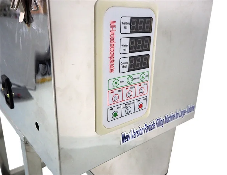 Multi-functional packaging, suitable for many types of goods, stainless steel housing, the appearance of fine high-end. Whole intelligent design, simple operation, with a new foot switch discharge operation more convenient and durable, sophisticated sensors quantitative, three level vibration cutting, adjustable, microcomputer control board more durable energy conservation, the use of four casters for easy bottom moving, fast, error is small, high performance, filling, bag, about one minute 10-20 different items depending on the package may be, 25-1200g quantitative, between the number of pro-grams according to their needs PC board above setting adjustment. 2-year warranty and lifetime maintenance.