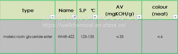 WMR-422 resin is lighter color, stable rosin modified maleic acid resin, which is made of rosin and nonsaturated polyacid as basic ingredients, developed through refining, decolorization, modification process. The paint, coating produced with WMR-422 resin has the advantage of high brilliance and hardness, powerful adhesive force, etc.