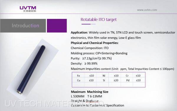 ITO targets are widely used in TN, STN liquid crystal display (LCD), touch panel (TP), semiconductor electronics, solar energy PV thin film, Low-e glass film.