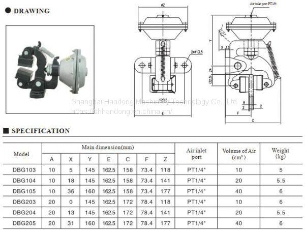 This vertical installation caliper disc brake with different size of cylinder, so their produce braking force is different. Like the DBG103 and DBG203 two models of brakes, they are equiped with 3" cylinder head, DBG104 and DBG204 brakes with 4" cylinder head, while DBG105 and DBG205 pneumatic brakes with 5" cylinder. The cylinder head size larger, it transmit braking force is larger, too.