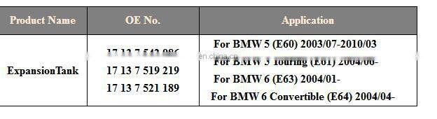 Home > Products > Other Parts > FOR BWM Auto Coolant Expansion Tank for E60/E61/E63/E64 OEM# 17137542986 #17137519219 #17137521189