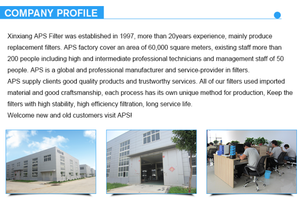 Xinxiang APS Filter Co., Ltd. Was established in 1997, APS have a production construction area of 60, 000 square meters, plus a 1000 square meters working and living area including modern office building, multi-function hall and staff apartment, etc, existing staff more than 200 people including high and intermediate professional technicians and management staff of 50 people. APS Filter Co., Ltd is a global and professional manufacturer and service-provider in compressor filter element and post-treatment equipment with integration of R&D, design, manufacture and marketing.