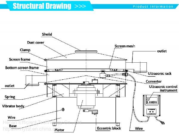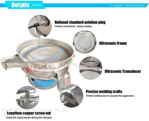 ultrasonic vibrating screen sieve is able to convert electric energy with 220V,50Hz or 110V,60Hz into high frequency electric energy with 18KHz and then puts it into ultrasonic energy exchanger to make it change into mechanical virbration with 18KHz and attains the purpose of high effciency sieve and cleaning mesh, which makes it easy to sieve the superfine powder.