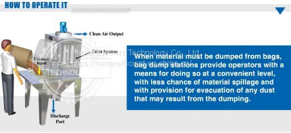 Bag dump stations (also known as manual dumping stations) collect dust generated when dumping powder and bulk solids from bags, boxes, drums, and other containers, and return the material to the hopper.