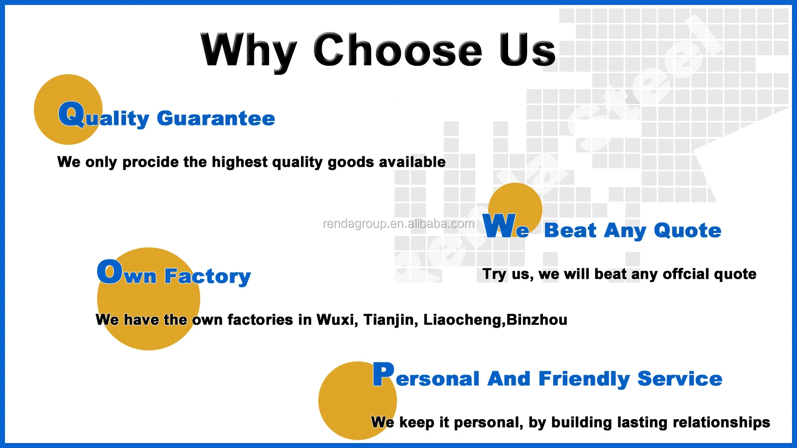 We own our own steel factory which mainly produces seamless pipe, spiral pipe, square and rectangular tube, galvanized pipe and so on. In addition, RENDA also have deeply cooperation with Jinan Steel, Laiwu Steel, Handan Steel, Anyang Steel and Maanshan Steel etc.Our company always focuses on the integration of resources, also with the concept of win-win cooperation. We look forward to be your reliable and quality partner!RENDA has been in steel manufacturing and trading business since 2002. With more than 14 years' commitment, RENDA always stick to the principle: best service derived from the best quality, developed into the Chinese largest steel manufacturing conglomerate.