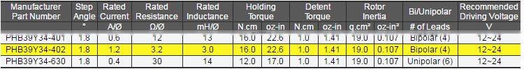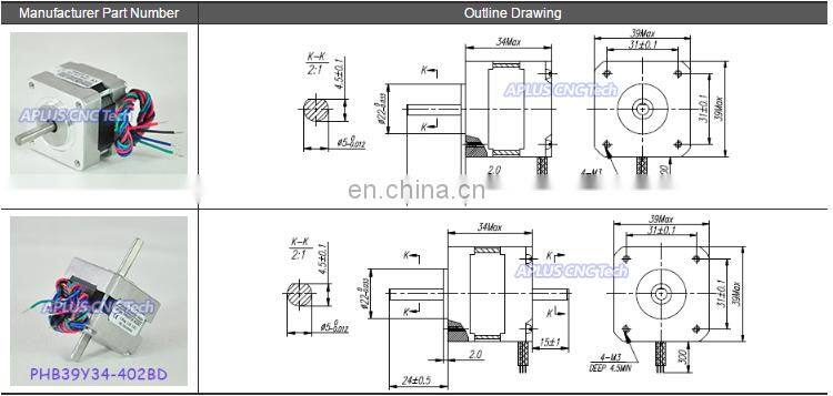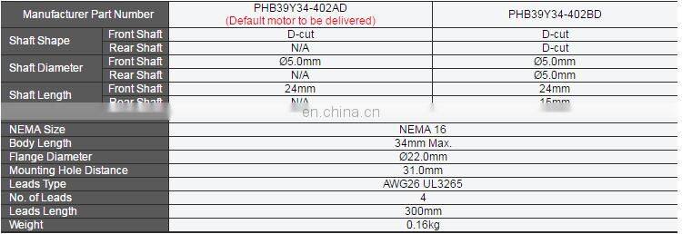 NOTE: 1.This stepper motor (MPN PHB39Y34-402) could be supplied to you with different mechanical specs of shaft, and the detailed info could be found in the following two tables. When placing your order, PLEASE LEAVE A MESSAGE TO US with the exact part number you need. Once the ordered item is shipped out of our warehouse, any requirement of changing the item is NOT acceptable.