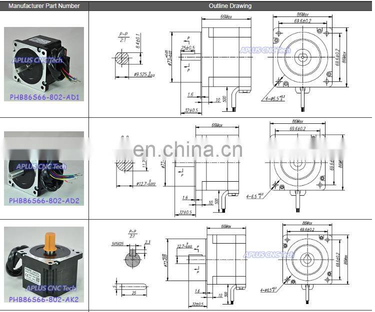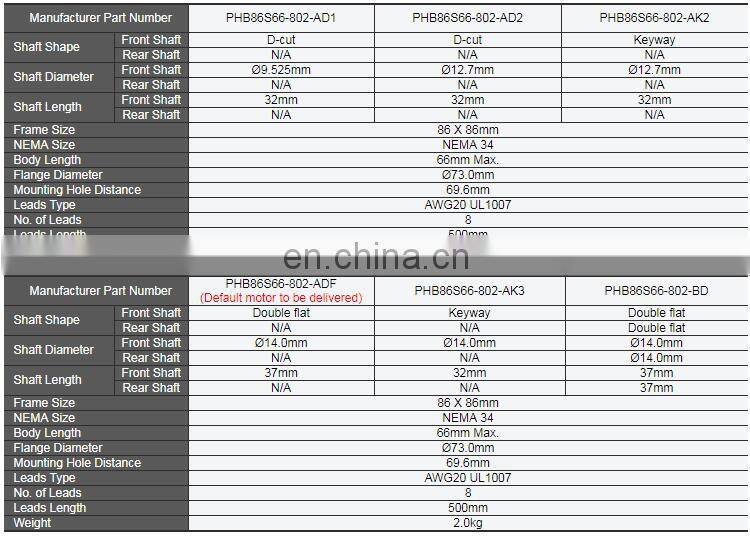 NOTE: 1.This stepper motor (MPN PHB86S66-802) could be supplied to you with different mechanical specs of shaft, and the detailed info could be found in the following two tables. When placing your order, PLEASE LEAVE A MESSAGE TO US with the exact part number you need. Once the ordered item is shipped out of our warehouse, any requirement of changing the item is NOTacceptable.