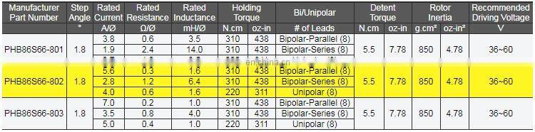 This stepper motor (MPN PHB86S66-802) is supplied by one of the China's top stepper motor suppliers (PrimoPal Motor). It's a NEMA 34 hybrid stepper motor with 1.8° step angle (200 steps/revolution) and body length of 66mm, made of high-quality cold rolled steel sheet and anti-high temperature permanent magnet. The rated current is 5.6A per phase, allowing for the holding torque of 310Ncm (438oz-in), if connected as bipolar-parallel. This high-performance and high-reliability motor is terminated with 8 flying ended lead wires, providing the maximum flexibility for your applications, including bipolar-parallel, bipolar-series and unipolar connections.