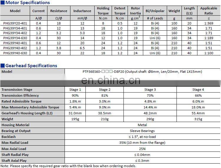 PrimoPal's PHG series hybrid stepper gearmotor offers a wide range of gear ratios to fulfill your project needs. The planetary gearhead (transmission series) and spur gearbox have been strictly tested to ensure long life and maximum efficiency. They are low-cost solutions and can perfectly meet your needs of motion or automation control. Besides, high precision gearhead, custom motor winding and gearhead specs are also available.
