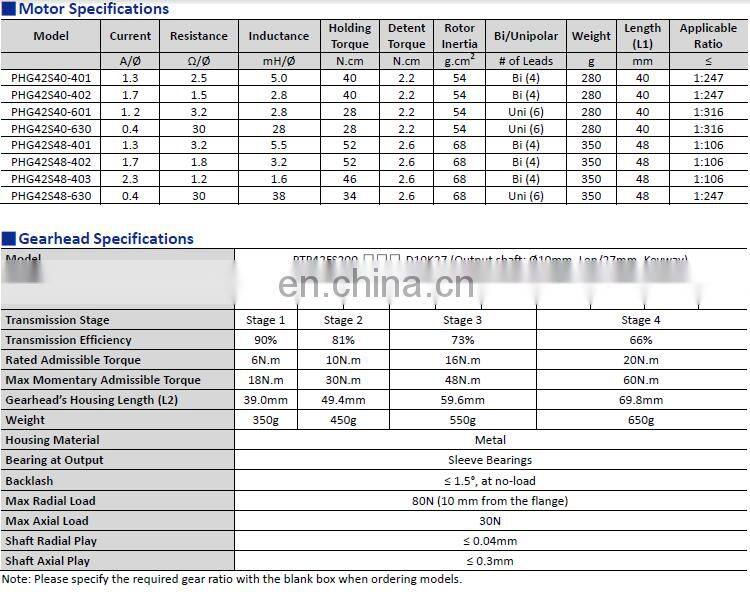 PrimoPal's PHG series hybrid stepper gearmotor offers a wide range of gear ratios to fulfill your project needs. The planetary gearhead (transmission series) and spur gearbox have been strictly tested to ensure long life and maximum efficiency. They are low-cost solutions and can perfectly meet your needs of motion or automation control. Besides, high precision gearhead, custom motor winding and gearhead specs are also available.